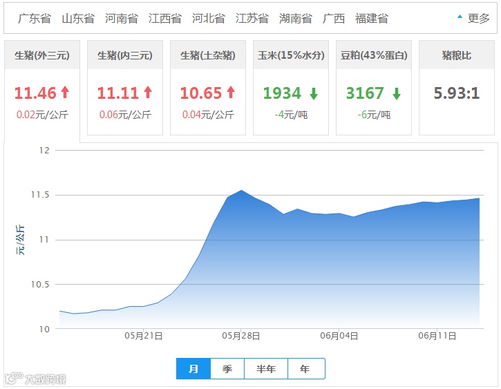 2018年06月14日全国外三元生猪价格行情涨跌表