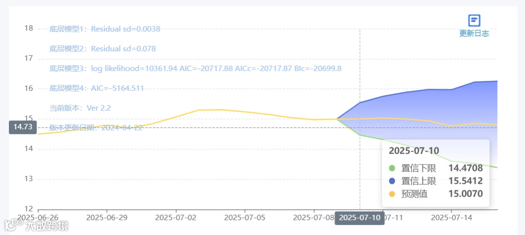 玄田算法是由项目课题组团队原创的非经典逻辑数值聚合理论和不确定性预测方法,构建了基于一致模算子的生猪价格预测模型。该模型采用的聚合函数及一致模相关理论与方法已获得多项国家自然科学基金和省级自然科学资金资助,并获得多项省级自然科学奖奖项。07月10日预测猪价为15.0070,置信区间在14.4708--15.5412之间。07月11日预测猪价为15.0352;07月12日预测猪价为15.0036。