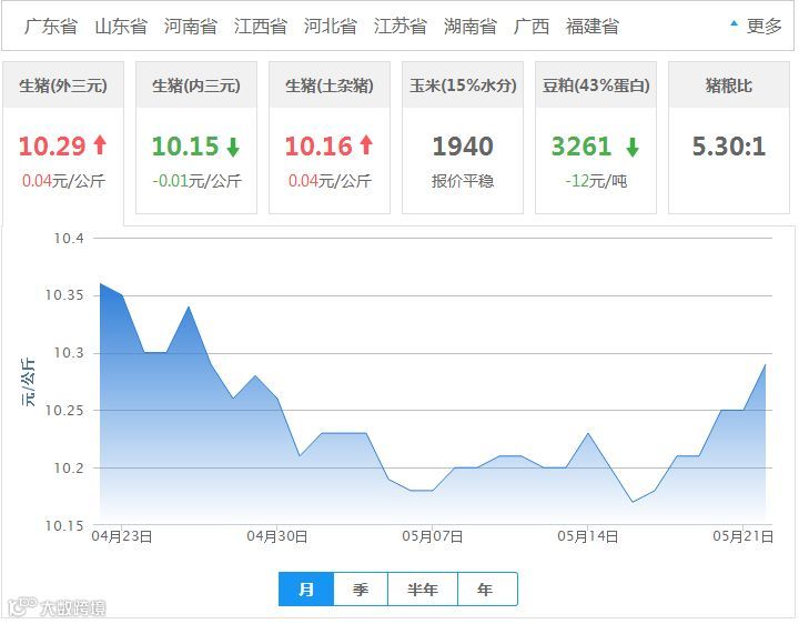 2018年05月22日全国外三元生猪价格行情涨跌表