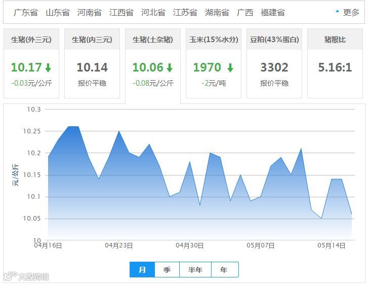 2018年05月16日全国外三元生猪价格行情涨跌表