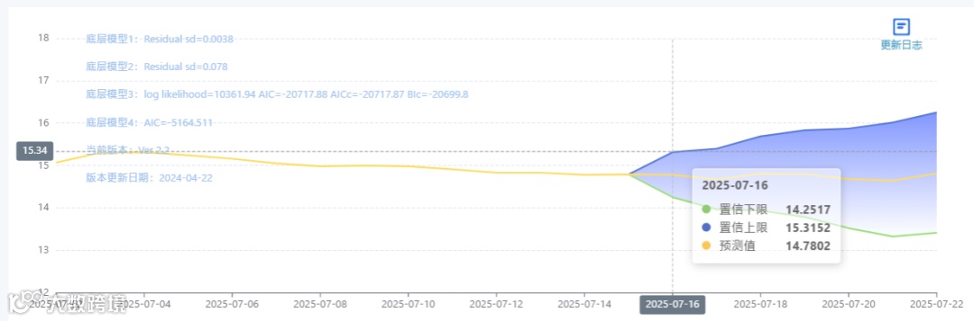 玄田算法是由项目课题组团队原创的非经典逻辑数值聚合理论和不确定性预测方法,构建了基于一致模算子的生猪价格预测模型。该模型采用的聚合函数及一致模相关理论与方法已获得多项国家自然科学基金和省级自然科学资金资助,并获得多项省级自然科学奖奖项。07月16日预测猪价为14.7802,置信区间在14.2517--15.3152之间。07月17日预测猪价为14.6714;07月18日预测猪价为14.8077。