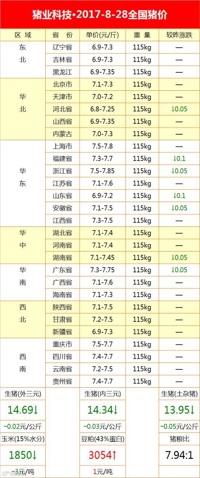2017年8月28日据猪价格网统计全国生猪均价为14.69元/公斤,较昨日猪价下跌0.02元/公斤,较上周猪价上涨0.02元/公斤,涨幅维持在0.03-0.40元/公斤,跌幅维持在0.01-0.15元/公斤。全国上涨地区较少,下跌地区较多。新疆、陕西省、甘肃省、内蒙古、广西、海南省、黑龙江、四川省、贵州省、云南省和重庆市上涨,其余各省市均出现一定幅度的下跌或持平。今日猪价涨幅收窄,下跌地区增多。我们一直有在文中提到,市场需求暂无明显好转,即便标猪供应偏紧也难以对猪价形成太大支撑,只要屠宰企业收猪难度稍有缓解,企业的压价心态就会再次上涨,毕竟消费摆在那里,猪肉需求暂时难以有实质性好转。对此养殖户也不必过度担心,目前的调整属于正常现象,且稳定缓慢的上涨,让上涨的时间更长一点对我们来说才是件好事。短时间的暴涨行情必定预示着暴跌即将到来,而长期盈利才是我们的目标。