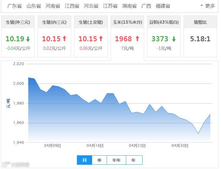 2018年05月05日全国外三元生猪价格行情涨跌表