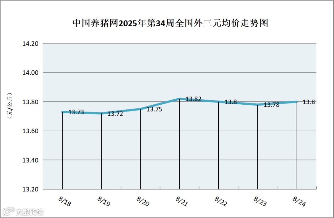 据中国养猪网猪价系统数据监测,2025年第34周(2025年08月18日至2025年08月24日)全国外三元生猪价格周初小幅上涨,周中至周末震荡回调,整体区间在13.72-13.82元/公斤之间!周初猪价为13.73元/公斤,周末猪价为13.8元/公斤,全周猪价累计上涨了0.07元/公斤。