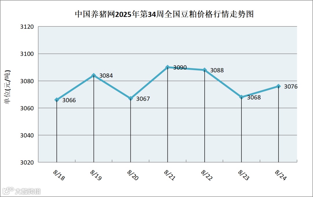 据中国养猪网猪价系统数据监测,2025年第34周(2025年08月18日至2025年08月24日)本周豆粕价格涨跌交替,整体波动不大。全周豆粕价格区间在3066-3090元/吨,周初豆粕价格为3066元/吨,周末价格为3076元/吨,全周豆粕价格累计上涨了10元/吨。