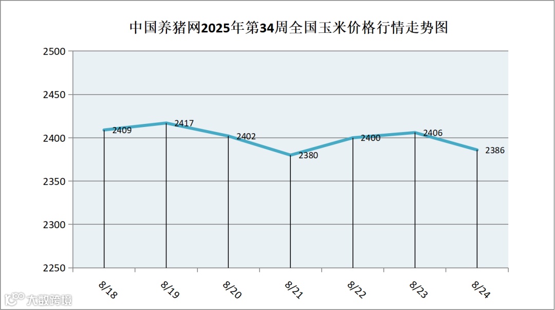 据中国养猪网猪价系统数据监测,2025年第34周(2025年08月18日至2025年08月24日)本周玉米价格周初先跌后涨,整体小幅降温,全周玉米价格区间在2380-2417元/吨之间,周初玉米价格为2409元/吨,周末价格为2386元/吨,全周玉米价格累计下跌了13元/吨。