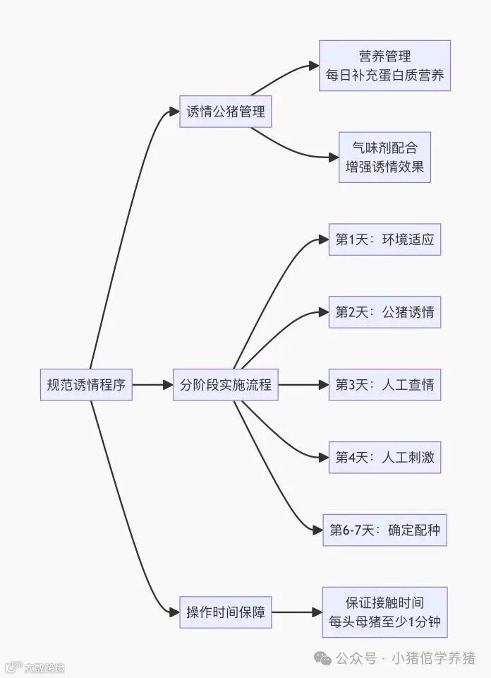 推荐从断奶前7天开始至断奶后7天,每日添加专用生殖营养补充剂,连续使用14天。断奶后额外补充能量物质,结合增量饲喂,可有效促进发情启动。四、执行规范的诱情程序