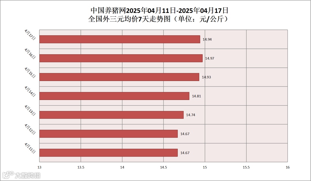 2025年04月17日(星期四),据中国养猪网猪价系统监测,全国外三元均价为14.94元/公斤,猪价较昨日(14.97元/公斤)下跌了0.03元/公斤,较上月(14.66元/公斤)上涨了0.28元/公斤。