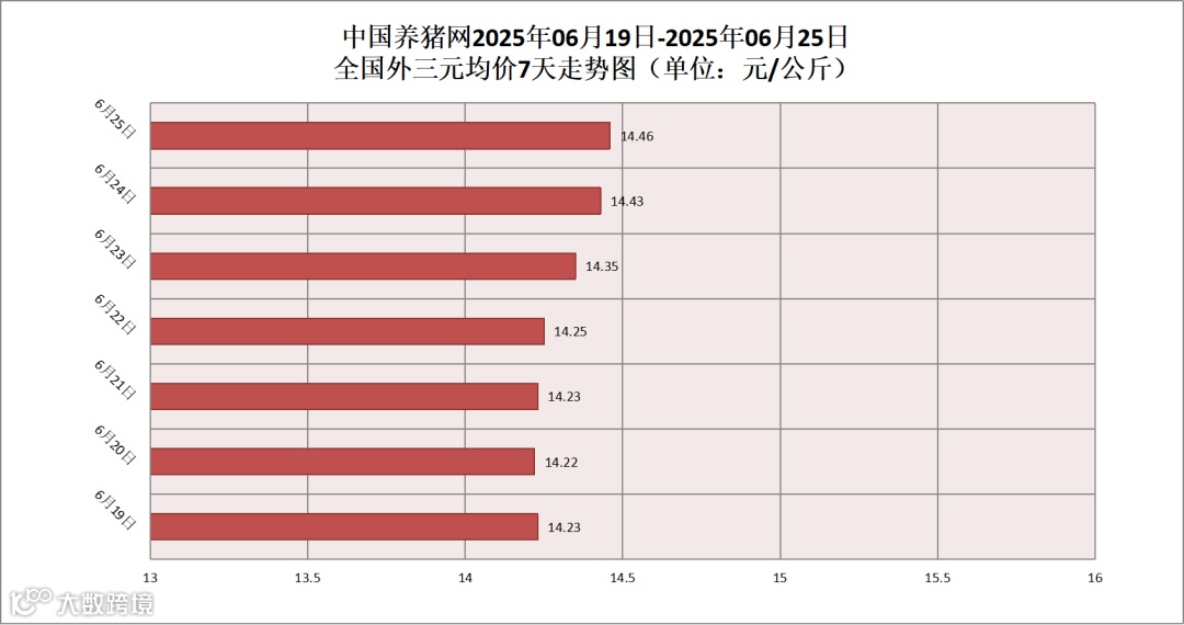 2025年06月25日(星期三),据中国养猪网猪价系统监测,全国外三元均价为14.46元/公斤,猪价较昨日(14.43/元/公斤)上涨了0.03元/公斤,较上月(14.26元/公斤)上涨了0.20元/公斤。