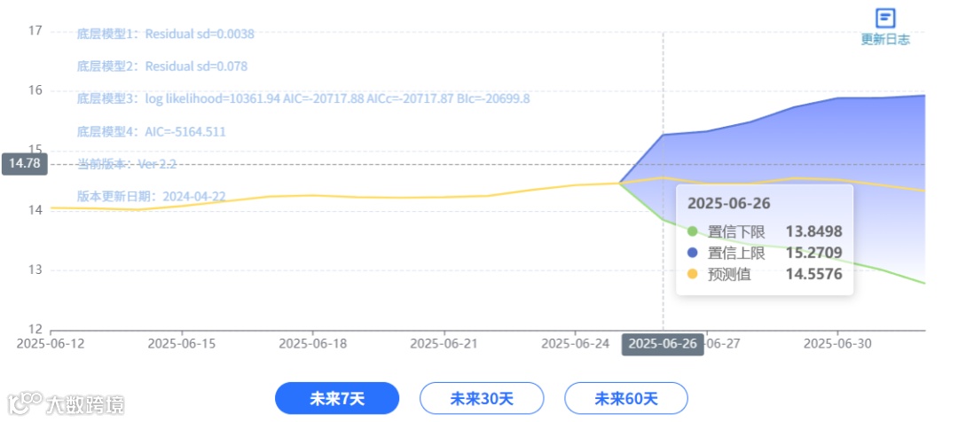 玄田算法是由项目课题组团队原创的非经典逻辑数值聚合理论和不确定性预测方法,构建了基于一致模算子的生猪价格预测模型。该模型采用的聚合函数及一致模相关理论与方法已获得多项国家自然科学基金和省级自然科学资金资助,并获得多项省级自然科学奖奖项。06月26日预测猪价为14.5576,置信区间在13.8498--15.2709之间。06月27日预测猪价为14.4511;06月28日预测猪价为14.4531。