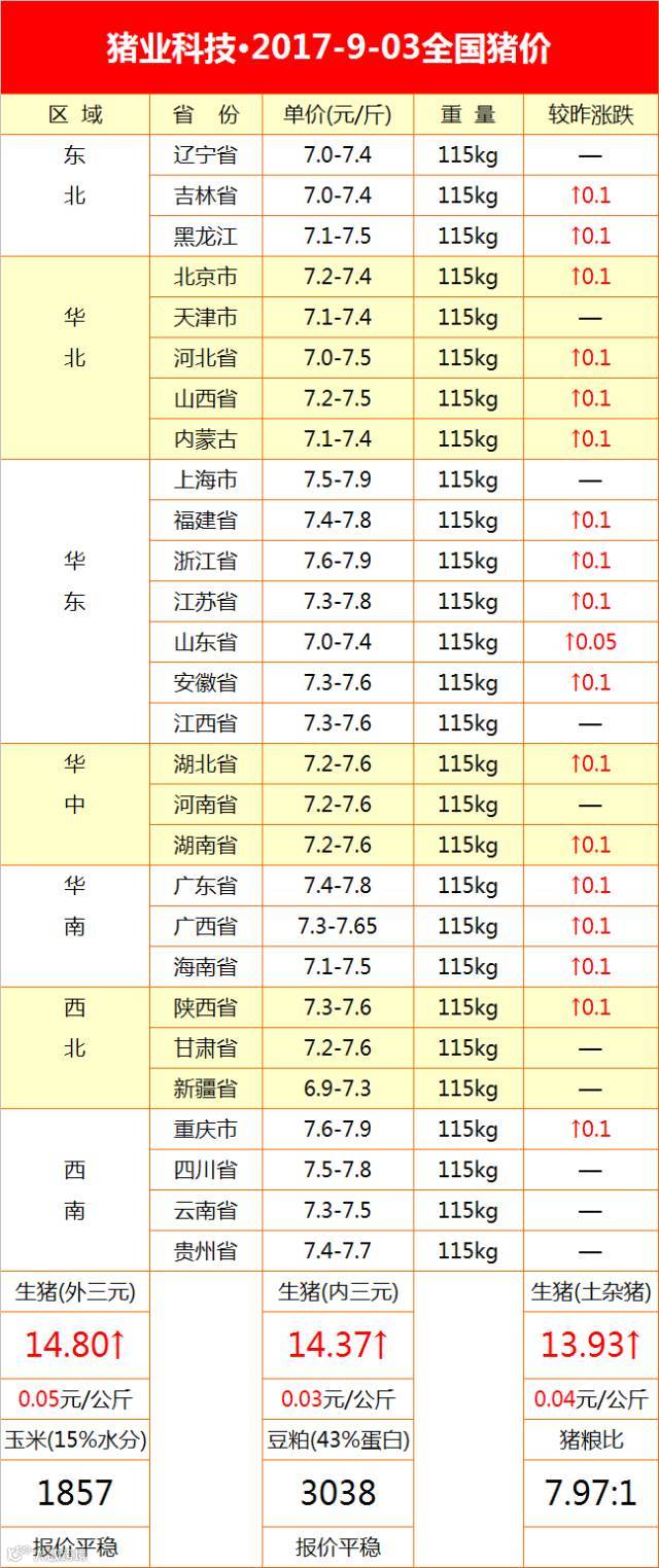 【后市分析】:今日全国报价地区中,外三元均价最高省份为上海市15.55元/公斤,最低省份为山东省14.26元/公斤。今日猪价延续涨势,且较昨日涨幅扩大。短期来看,需求端将有一小波利好。首先是开学季导致集中消费逐渐恢复,其次是降温很明显,市场猪肉消费开始增加,而南方地区因为中元节的临近市场猪肉需求也会出现短暂性的上升。另外就是中下旬之前屠宰企业要为中秋和国庆备货。可以说猪肉需求的增加对猪价形成利好,短期猪价有望延续涨势。而双节过后,业内认为猪价将会迎来一波小跌的走势,基本上10和11月份的走势不太被看好,而9月份的走势恐怕也不会比8月份好。因此建议养殖户逢高出栏,不过过度布局后市。