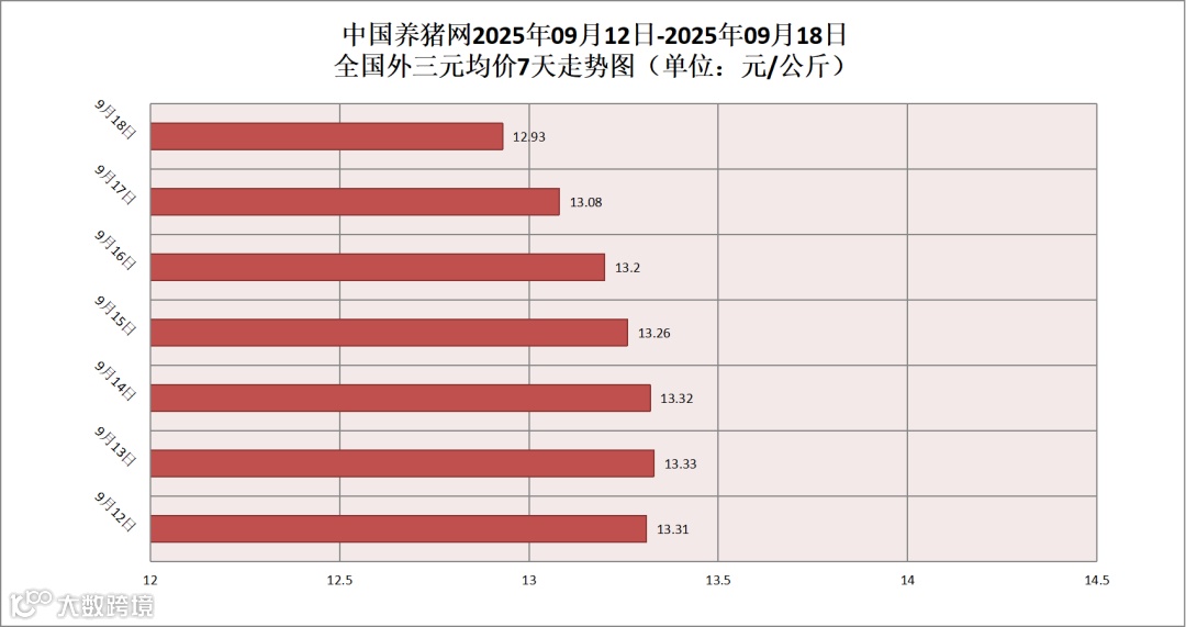 2025年09月18日(星期四),据中国养猪网猪价系统监测,全国外三元均价为12.93元/公斤,猪价较昨日(13.08元/公斤)下跌了0.15元/公斤,较上月(13.73元/公斤)下跌了0.80元/公斤。
