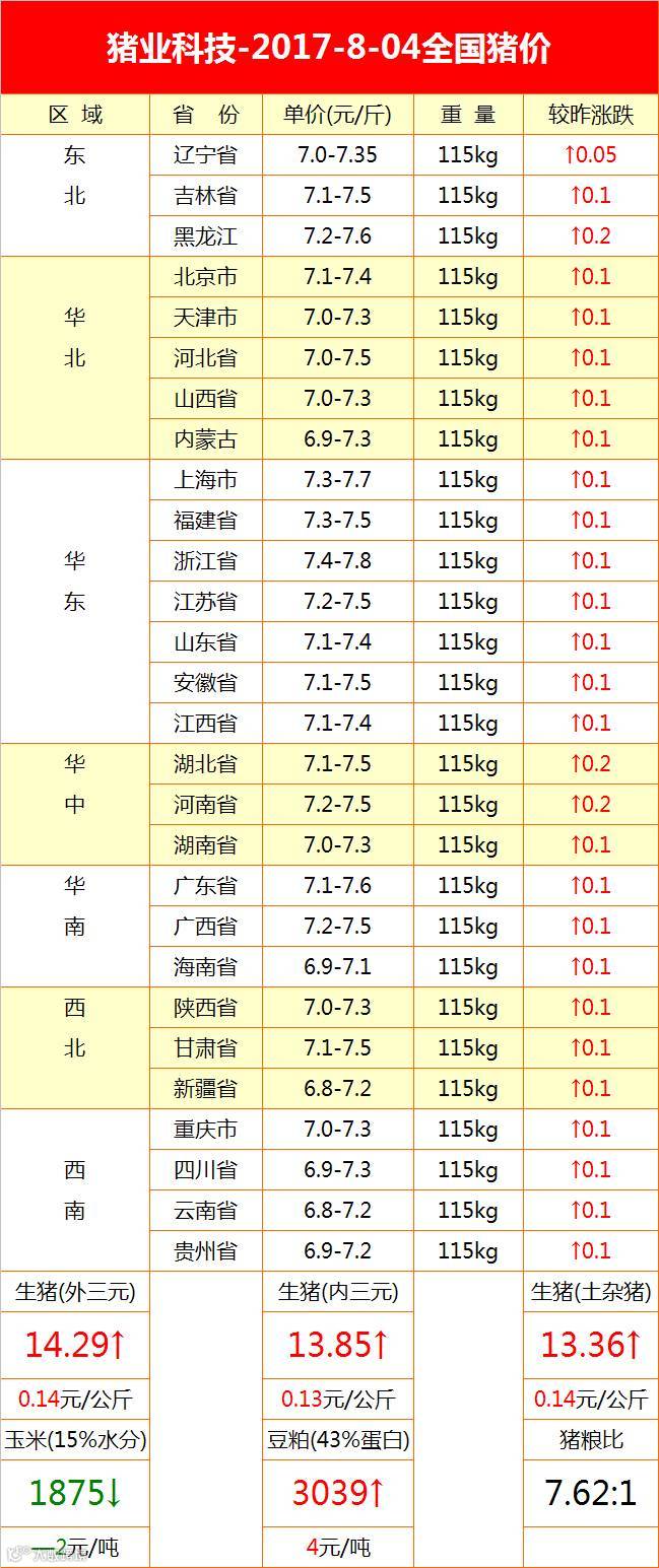 2017年8月3日全国各省外三元猪均价为14.10元/公斤,较昨日上涨0.10元/公斤,较上周同期猪价(7月27日)上涨0.29元/公斤。