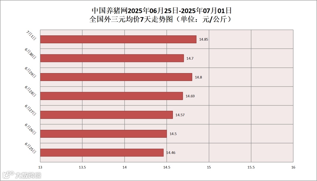 2025年07月01日(星期一),据中国养猪网猪价系统监测,全国外三元均价为14.85元/公斤,猪价较昨日(14.70元/公斤)下跌了0.15元/公斤,较上月(14.41元/公斤)上涨了0.44元/公斤。