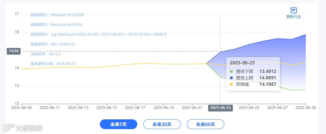 玄田算法是由项目课题组团队原创的非经典逻辑数值聚合理论和不确定性预测方法,构建了基于一致模算子的生猪价格预测模型。该模型采用的聚合函数及一致模相关理论与方法已获得多项国家自然科学基金和省级自然科学资金资助,并获得多项省级自然科学奖奖项。06月23日预测猪价为14.1887,置信区间在13.4912--14.8991之间。06月24日预测猪价为14.1754;06月25日预测猪价为14.2825。