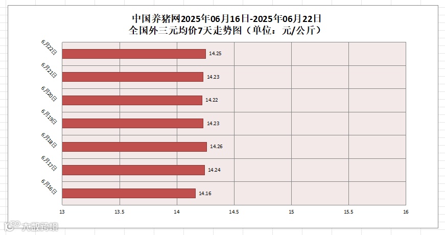 2025年06月22日(星期日),据中国养猪网猪价系统监测,全国外三元均价为14.25元/公斤,猪价较昨日(14.23/元/公斤)上涨了0.02元/公斤,较上月(14.48元/公斤)下跌了0.23元/公斤。