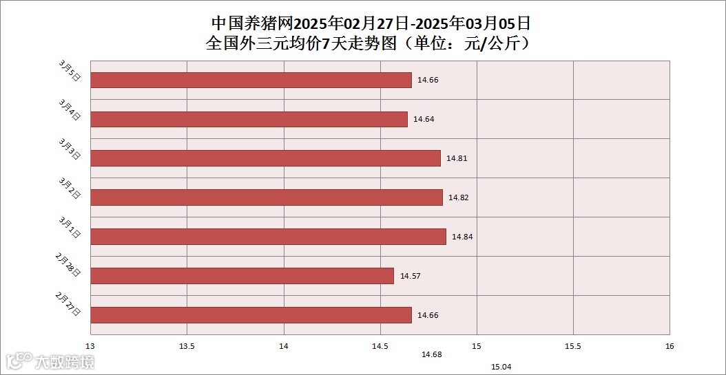 其他生猪品种方面,生猪内三元均价为14.56元/公斤,价格较昨日(14.66元/公斤)下跌了0.10元/公斤;生猪土杂猪均价为14.27元/公斤,价格较昨日(14.39元/公斤)下跌了0.12元/公斤。