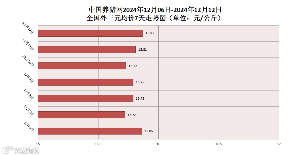 根据“2024年12月12日-中国养猪网生猪(外三元)均价涨跌表”发现,国内外三元生猪价格呈现多地全面上涨的态势,在全国可监测的31个省/市/自治区中,猪价走势为26涨3平2跌。目前猪价连涨但涨幅有限,具体来看,北方猪价面临回落风险,消费城市白条购销一般,市场情绪较差。然而,气温下降带动内销市场改善,屠企开工率增加。生猪出栏方面,华东猪企上量增加,华中及西北缩量,北方养殖端挺价情绪松动,华东及华中散户出栏增加,南方市场购销谨慎。整体来看,生猪市场涨跌情绪并存,预计未来1~2日北方猪价冲高下跌,南方延续震荡偏强,区域走势分歧,未来需密切关注集团猪企出栏节奏。