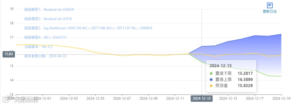 玄田算法是由项目课题组团队原创的非经典逻辑数值聚合理论和不确定性预测方法,构建了基于一致模算子的生猪价格预测模型。该模型采用的聚合函数及一致模相关理论与方法已获得多项国家自然科学基金和省级自然科学资金资助,并获得多项省级自然科学奖奖项。12月13日预测猪价为15.8329,置信区间在15.2817--16.3889之间。12月14日预测猪价为15.6839;12月15日预测猪价为15.8249。