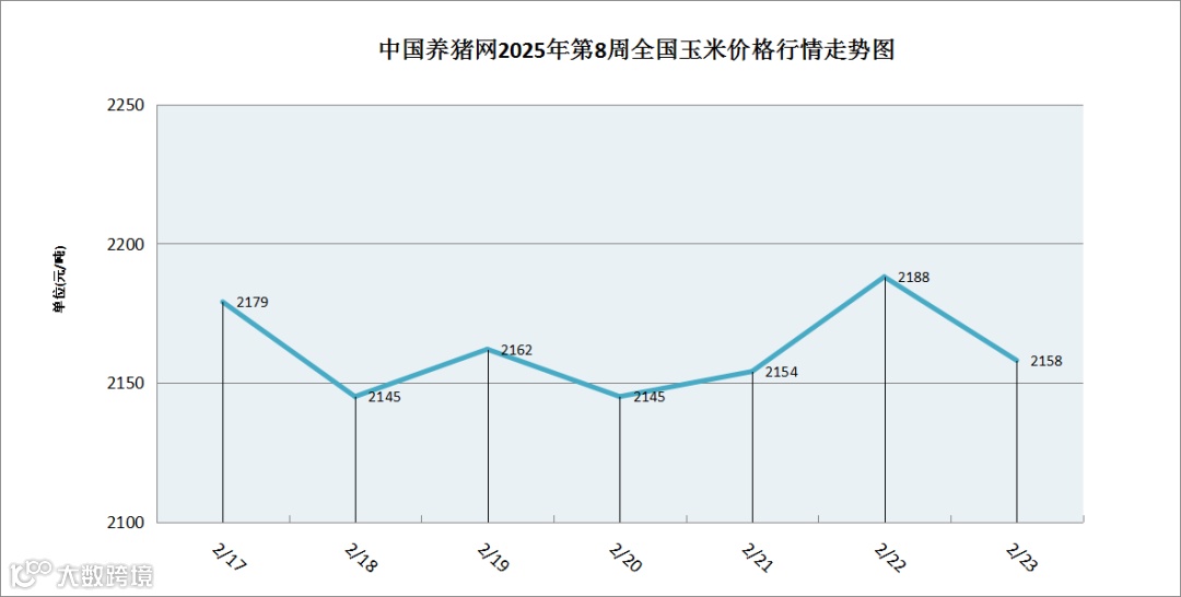 据中国养猪网猪价系统数据监测,2025年第8周(2025年02月17日至2025年02月23日)本周玉米价格走势,周初至周末玉米价格窄幅波动。全周玉米价格区间在2145-2188元/吨之间,周初玉米价格为2179元/吨,周末价格为2158元/吨,全周玉米价格累计下跌了21元/吨。