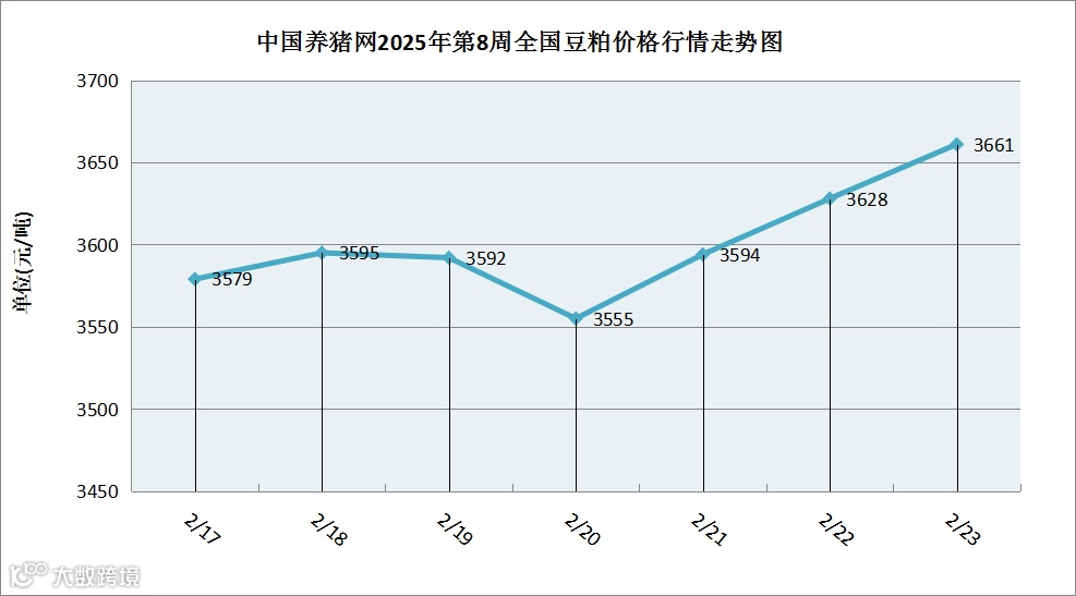 据中国养猪网猪价系统数据监测,2025年第8周(2025年02月17日至2025年02月23日)本周豆粕价格周初窄幅上扬,周中震荡下行,触底反弹,周中至周末直线上涨。全周豆粕价格区间在3555-3661元/吨,周初豆粕价格为3579元/吨,周末价格为3661元/吨,全周豆粕价格累计上涨了82元/吨。