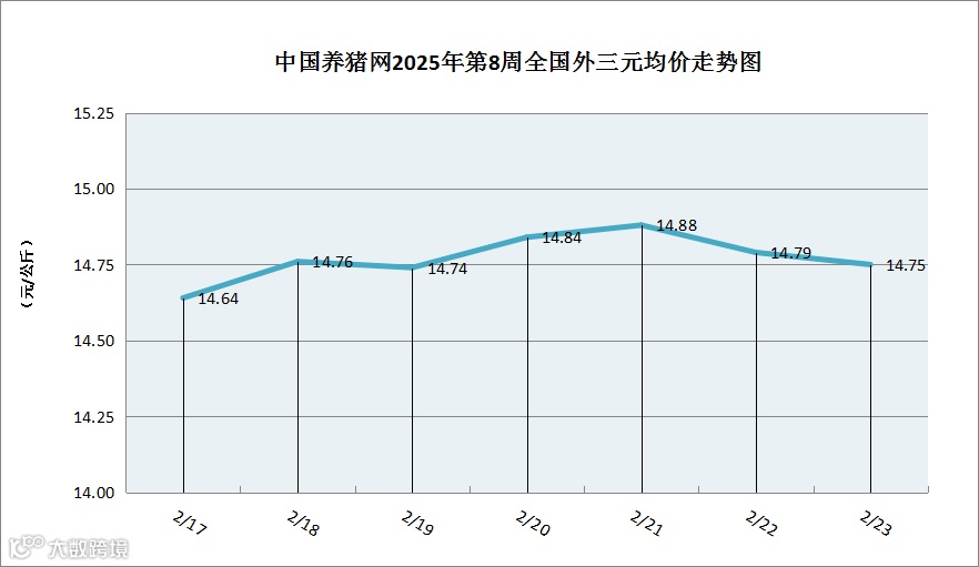 据中国养猪网猪价系统数据监测,2025年第8周(2025年02月17日至2025年02月23日)全国外三元生猪价格周初涨跌互现,周中持续小幅上涨,周末小幅下跌,整体区间在14.64-14.88元/公斤之间!周初猪价为14.64元/公斤,周末猪价为14.75元/公斤,全周猪价累计上涨了0.11元/公斤。