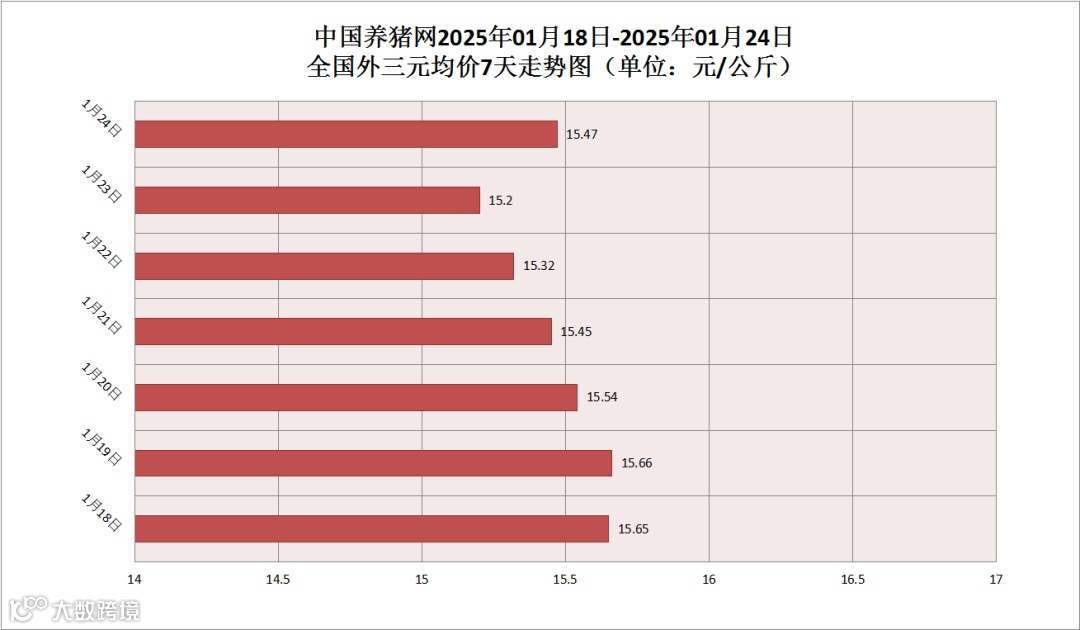 2025年01月24日(星期五),据中国养猪网猪价系统监测,全国外三元均价为15.47元/公斤,猪价较昨日(15.20元/公斤)上涨了0.27元/公斤,较上月(15.39元/公斤)上涨了0.08元/公斤。