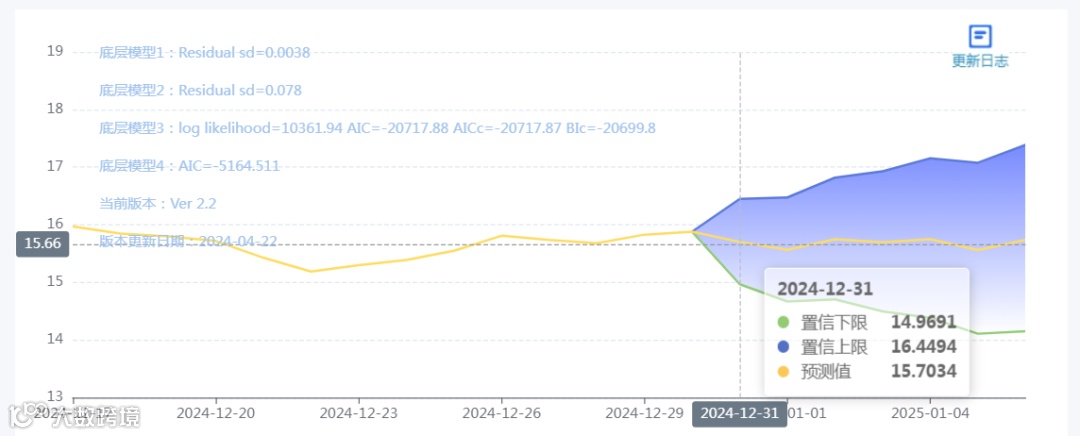 玄田算法是由项目课题组团队原创的非经典逻辑数值聚合理论和不确定性预测方法,构建了基于一致模算子的生猪价格预测模型。该模型采用的聚合函数及一致模相关理论与方法已获得多项国家自然科学基金和省级自然科学资金资助,并获得多项省级自然科学奖奖项。12月31日预测猪价为15.7034,置信区间在14.9691--16.4494之间。01月01日预测猪价为15.5666;01月02日预测猪价为15.7500。