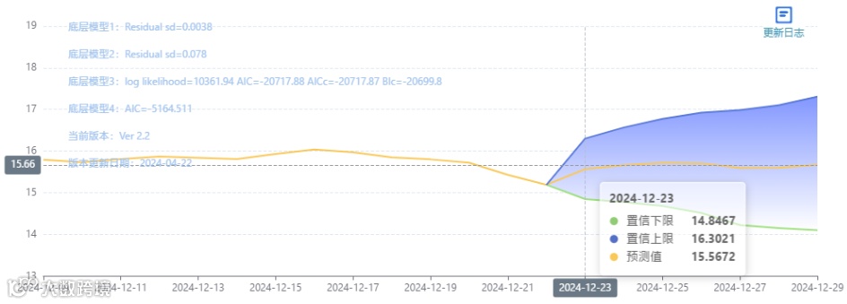 玄田算法是由项目课题组团队原创的非经典逻辑数值聚合理论和不确定性预测方法,构建了基于一致模算子的生猪价格预测模型。该模型采用的聚合函数及一致模相关理论与方法已获得多项国家自然科学基金和省级自然科学资金资助,并获得多项省级自然科学奖奖项。12月23日预测猪价为15.5672,置信区间在14.8467--16.3021之间。12月24日预测猪价为15.6583;12月25日预测猪价为15.7193。