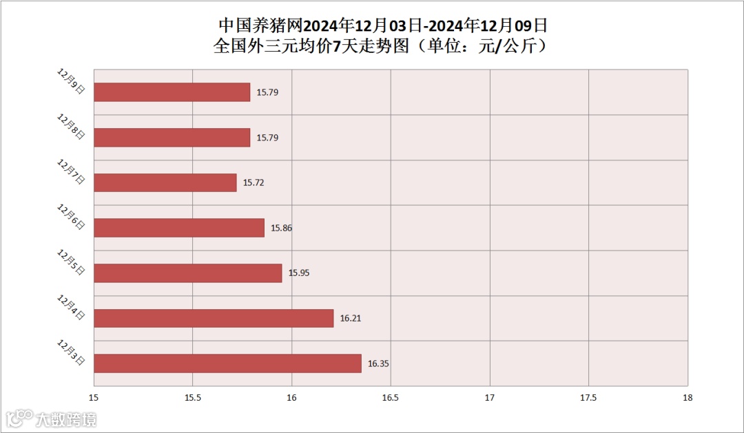其他生猪品种方面,生猪内三元均价为15.91元/公斤,价格较昨日(15.98元/公斤)下跌了0.07元/公斤;生猪土杂猪均价为15.69元/公斤,价格较昨日(15.80元/公斤)下跌了0.11元/公斤。