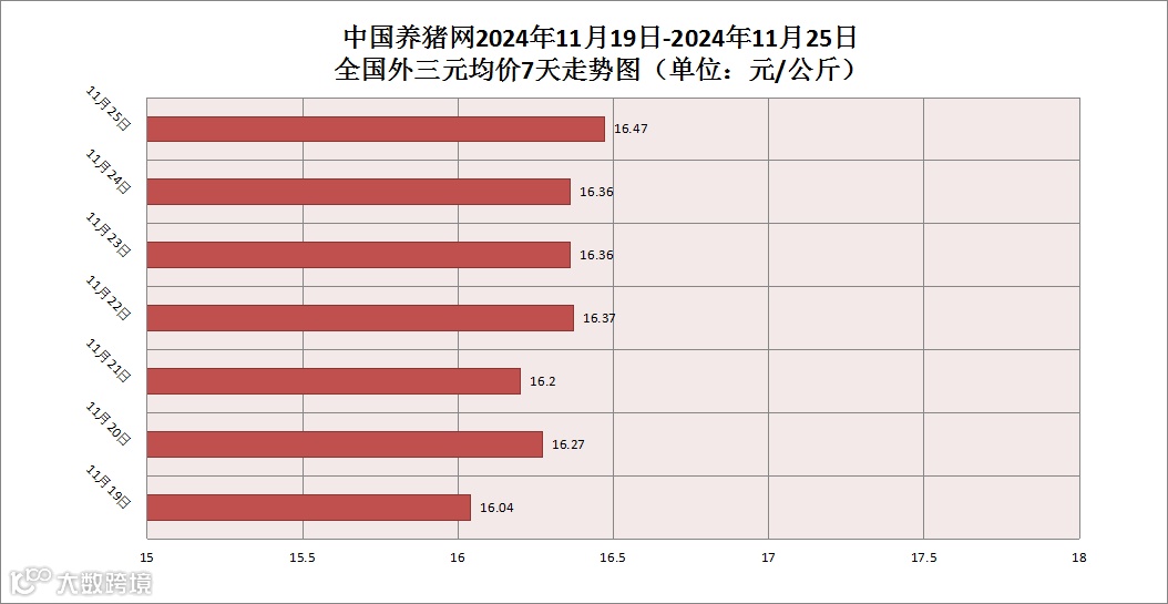 2024年11月25日(星期一),据中国养猪网猪价系统监测,全国外三元均价为16.47元/公斤,猪价较昨日(16.36元/公斤)上涨了0.11元/公斤,较上月(17.58元/公斤)下跌了1.11元/公斤。