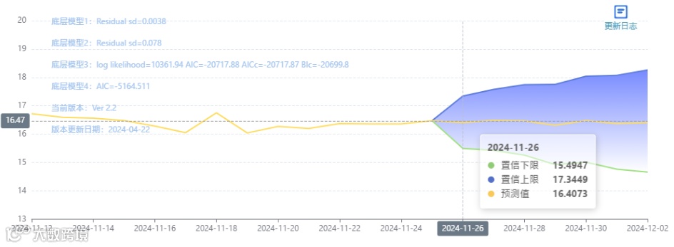 玄田算法是由项目课题组团队原创的非经典逻辑数值聚合理论和不确定性预测方法,构建了基于一致模算子的生猪价格预测模型。该模型采用的聚合函数及一致模相关理论与方法已获得多项国家自然科学基金和省级自然科学资金资助,并获得多项省级自然科学奖奖项。11月26日预测猪价为16.4073,置信区间在15.4947--17.3449之间。11月27日预测猪价为16.4840;11月28日预测猪价为16.4679。