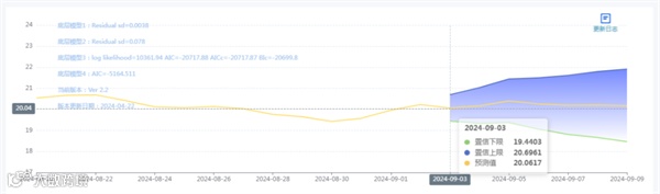 玄田算法是由项目课题组团队原创的非经典逻辑数值聚合理论和不确定性预测方法,构建了基于一致模算子的生猪价格预测模型。该模型采用的聚合函数及一致模相关理论与方法已获得多项国家自然科学基金和省级自然科学资金资助,并获得多项省级自然科学奖奖项。09月03日预测猪价为20.0617,置信区间在19.4403--20.6961之间。09月04日预测猪价为20.1707;09月05日预测猪价为20.4001。