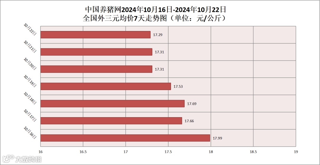 其他生猪品种方面,生猪内三元均价为17.30元/公斤,价格较昨日(17.30元/公斤)下跌了0.00元/公斤;生猪土杂猪均价为17.00元/公斤,价格较昨日(17.00元元/公斤)下跌了0.00元/公斤。