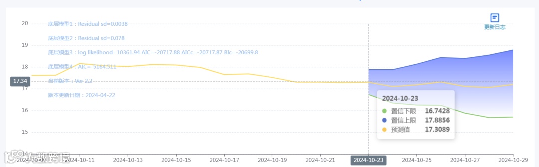 玄田算法是由项目课题组团队原创的非经典逻辑数值聚合理论和不确定性预测方法,构建了基于一致模算子的生猪价格预测模型。该模型采用的聚合函数及一致模相关理论与方法已获得多项国家自然科学基金和省级自然科学资金资助,并获得多项省级自然科学奖奖项。10月23日预测猪价为17.3089,置信区间在16.7428--17.8856之间。10月24日预测猪价为17.1125;10月25日预测猪价为17.1932。