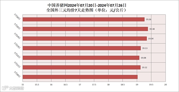 根据“2024年07月26日-中国养猪网生猪(外三元)均价涨跌表”发现,国内外三元生猪价格呈现冲高回落态势,猪价最高地区海南省为22.26元/公斤,最低地区新疆17.89元/公斤。青海、黑龙江、新疆猪价与昨日持平。目前,生猪价格由涨入跌,主要是由于消费支撑孱弱,白条走货不畅,下游贸易商减量稳价操作,屠企订单缩量,开工率下降。而在生猪供给方面,养殖端压栏惜售情绪偏弱,散户以及上市猪企出栏节奏加快。因此,基于多方博弈,猪价呈现下跌态势。