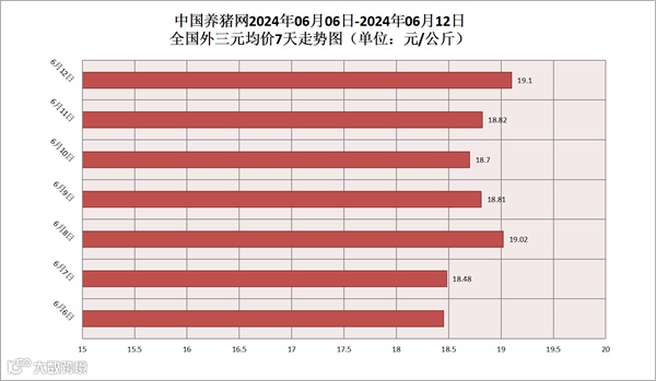 根据“2024年06月12日-中国养猪网生猪(外三元)均价涨跌表”发现,国内外三元生猪价格再次上涨,猪价最高地区海南省为21.36元/公斤,最低地区宁夏回族自治区17.56元/公斤。虽当前处于阶段性消费淡季,但自从5月中下旬后,国内生猪价格一反常态,呈一路红灯趋势,今日猪价再次创新高,均价高达19.10元/公斤。业内提及近期生猪供应的减少,养殖端挺价惜售心态较强以及猪企压栏现象明显,托起了生猪价格的快涨,而关于后续怎么走,还有待观察!