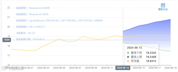玄田算法是由项目课题组团队原创的非经典逻辑数值聚合理论和不确定性预测方法,构建了基于一致模算子的生猪价格预测模型。该模型采用的聚合函数及一致模相关理论与方法已获得多项国家自然科学基金和省级自然科学资金资助,并获得多项省级自然科学奖奖项。06月13日预测猪价为18.9415,置信区间在18.3343--19.5469之间。06月14日预测猪价为19.0033;06月15日预测猪价为19.1141。