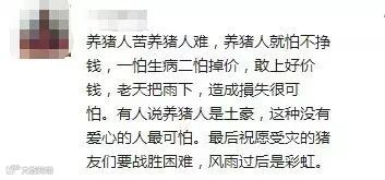 但令人温暖的是,一方有难八方支援,在这样的大灾大害面前,真正的养猪人都团结到了一起,一起为受灾的养猪人祈祷。以下几条评论是我们从后台数百条留言中筛选出来的,关切之心溢于言表。