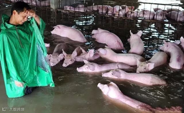 我们再就事论事,上面这张照片来自安徽六安一被淹猪场,当时的报道是里面6000头猪已无生还可能,饲养员正在和猪做最后的告别。说内心话,只要是个养猪人看了内心都不好受。因为只有他们自己才能体会养猪过程中的苦,把猪当做自己孩子一般,辛辛苦苦付出,看着它们慢慢长大,最后却被洪水所淹,自己却无能为力,还有什么能比这更心酸的吗?