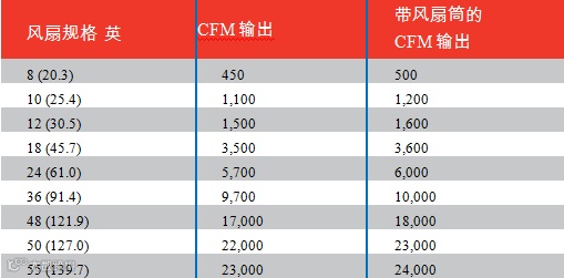 -表2列出了不同风机规格对应的的额定排风量CFM。