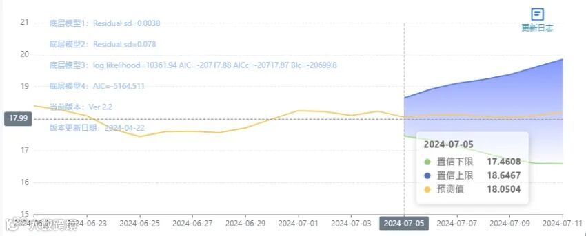 玄田算法是由项目课题组团队原创的非经典逻辑数值聚合理论和不确定性预测方法,构建了基于一致模算子的生猪价格预测模型。该模型采用的聚合函数及一致模相关理论与方法已获得多项国家自然科学基金和省级自然科学资金资助,并获得多项省级自然科学奖奖项。07月05日预测猪价为18.0504,置信区间在17.4608--18.6467之间。07月06日预测猪价为18.1124;07月07日预测猪价为18.1272。