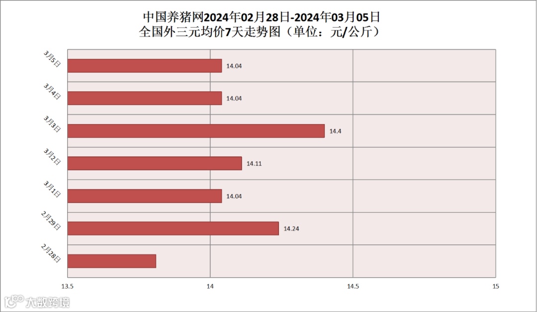 其他生猪品种方面,生猪内三元均价为14.02元/公斤,价格较昨日(14.06元/公斤)下跌了0.04元/公斤;生猪土杂猪均价为13.66元/公斤,价格较昨日(13.72元/公斤)下跌了0.06元/公斤。