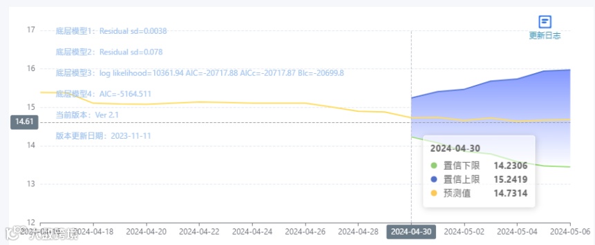 玄田算法是由项目课题组团队原创的非经典逻辑数值聚合理论和不确定性预测方法,构建了基于一致模算子的生猪价格预测模型。该模型采用的聚合函数及一致模相关理论与方法已获得多项国家自然科学基金和省级自然科学资金资助,并获得多项省级自然科学奖奖项。04月30日预测猪价为14.7314,置信区间在14.2306--15.2419之间。05月01日预测猪价为14.7389;05月02日预测猪价为14.6586。