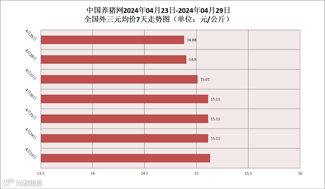 其他生猪品种方面,生猪内三元均价为14.77元/公斤,价格较昨日(14.81元/公斤)下跌了0.04元/公斤;生猪土杂猪均价为14.43元/公斤,价格较昨日(14.46元/公斤)下跌了0.03元/公斤。