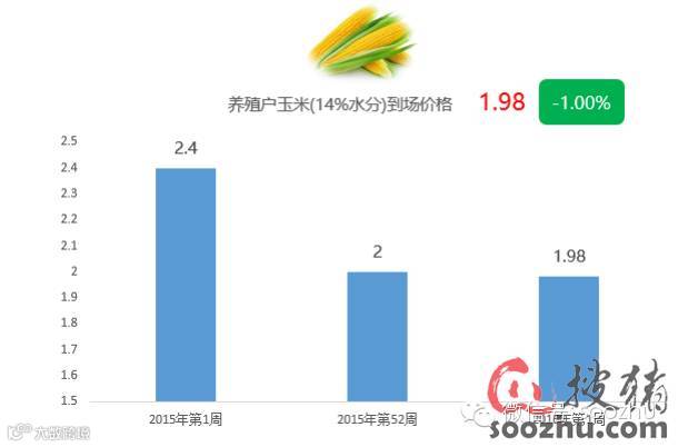 【饲料成本】2016年第1周,饲料成本变化不大,养殖户玉米到场价格跌破2元/公斤至1.98元/公斤,同比下跌幅度已达到17.5%。豆粕价格2.86元/公斤,同比下跌18.75%,育肥猪配合料价格2.76元/公斤,同比下跌13.75%。饲料成本继续整体保持低位,对养猪业继续利好。