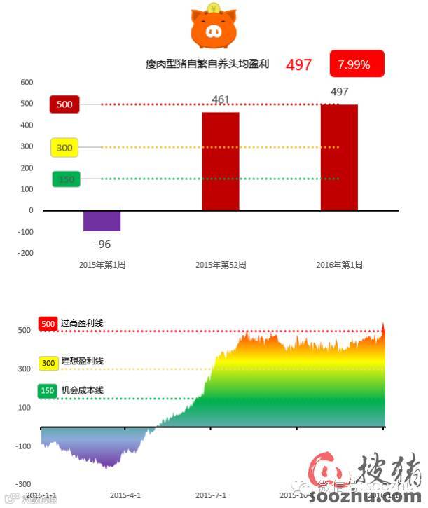 【自繁自养头均盈利】2016年第1周,瘦肉型自繁自养头均盈利水平达到497元,接近于500元的过高盈利线,较上周的461元增加了近8%,较去年同期的亏损96元,更是增幅巨大。头均盈利突破500元,意味着盈利过高后随即可能引来补栏的大幅增加,这对远期猪价来说不是好事。