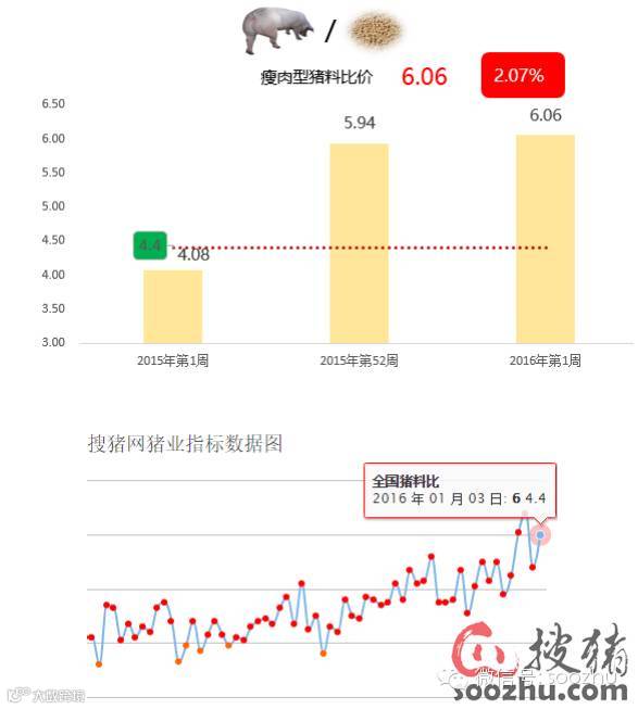 【猪料比价】2016年第1周,生猪市场便迎来开门红,猪料比价(瘦肉型猪出栏价格/育肥猪配合料价格)涨破6:1,达到6.06:1,较2015年最后一,5.94:1上涨了2.07%,较去年同期上涨了48.43%,涨幅近50%。表面看涨幅较大,但去年同期猪料比价仅4.08:1,远低于4.4:1的盈亏平衡线,正处于中度亏损。当前的猪料比价处于较高的盈利水平,距离历史高点仍有一定距离。