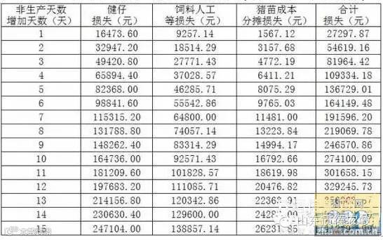非生产天数(天) 头均分娩胎数(胎) 理想胎均健仔(头) 单头母猪年提供健仔数(头) 由表1可知,假设胎均健仔以10.59来算,如非生产天数每减少1天,则年分娩胎数可以相应增加(2.348-2.459)/15≈0.007胎,单头母猪年提供健仔数提高(24.867-26.044)/15≈0.078头。由此可知,非生产天数每缩短1/0.078≈12.82天,相当于单头母猪年提供健仔数提高1头。 另外一方面,假设母猪年产胎次以2.40胎来算,如胎均健仔每提高0.1头,则单头母猪年提供健仔数可提高2.40*0.1=0.24头,即胎均健仔每提高1/0.24*0.1≈0.417头,相当于年提供健仔数提高1头。 综上可知,非生产天数每减少12.82天,与猪场胎均健仔提高0.417头所带来的效果是一样的,都可以使单头母猪年提供健仔数提高1头。故通过母猪非生产天数的控制,可以直接提高母猪的年产胎数,进而提高单头母猪年提供健仔数,从而提高猪场的生产效率。 因此,猪场胎均健仔水平固然很重要,但其对最终猪场生产成绩的影响也是有限的。母猪繁殖性能(胎均健仔)的提高,是个系统工程,所涉及技术工作较多,短期内难以实现,所以找到影响猪场生产效率主要因素——非生产天数,进行控制就显得很有现实意义。 2、非生产天数对猪场成本控制的影响 表2 一条2万线非生产天数增加给猪场带来的损失(按960头基础母猪测算)