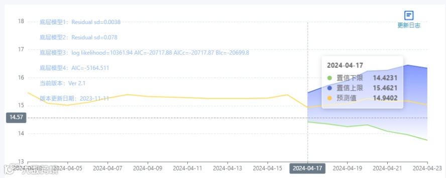 玄田算法是由项目课题组团队原创的非经典逻辑数值聚合理论和不确定性预测方法,构建了基于一致模算子的生猪价格预测模型。该模型采用的聚合函数及一致模相关理论与方法已获得多项国家自然科学基金和省级自然科学资金资助,并获得多项省级自然科学奖奖项。04月16日预测猪价为15.0392,置信区间在14.5355--15.5583之间。04月17日预测猪价为15.0096;04月18日预测猪价为14.9606。